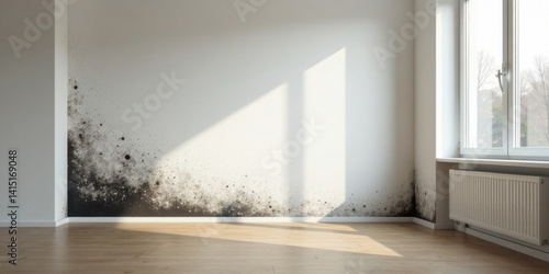 A sunlit room reveals a significant mold problem along the baseboards, requiring immediate remediation and repair to prevent further structural damage and health risks.