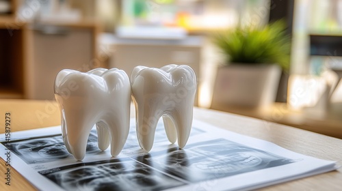 A tooth model placed next to dental x-rays for comparison, on a professional examination table