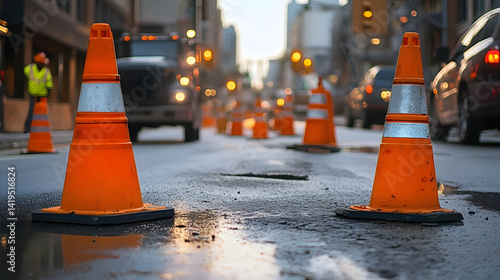 Detailed construction zone with temporary road signs, orange cones, reflective barriers, and a traffic flagger guiding vehicles