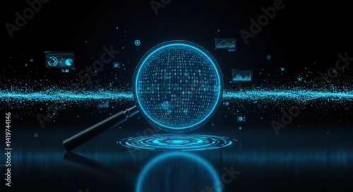 Magnifying glass hovers above a glowing digital data stream with binary code and holographic projections symbolizing a sophisticated digital investigation in a futuristic high-tech environment.