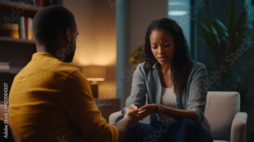 Young African American female psychologist keeping hand of wrist of male patient sitting in front of her and sharing his problems
