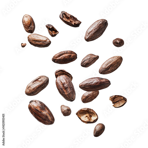 Falling cacao beans isolated on transparent background