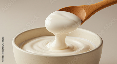 Creamy delight: Natural yogurt dripping from wooden spoon into a bowl