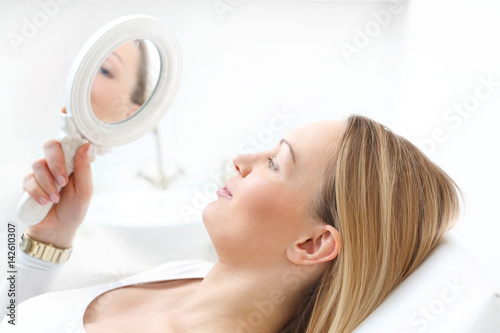 Piękna zadbana skóra twarzy.Kobieta przegląda w lusterku efekt zabiegu kosmetycznego.