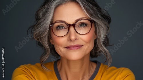 Woman with glasses and a yellow shirt. She is smiling and looking at the camera. Concept of warmth and friendliness