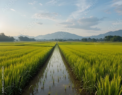 Rice plants in the garden with irrigation
