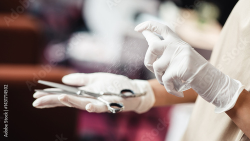 Beauty tools disinfection. Close up of master spraying sanitizer at scissors after client