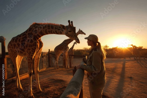 Zookeeper interacting with tall giraffes in enclosure at golden hour as sunset illuminates the outdoor wildlife habitat
