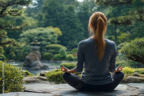 #940124610Young woman practicing yoga without stress in nature. Female sitting in lotus pose.Yoga mountains. Generative AI