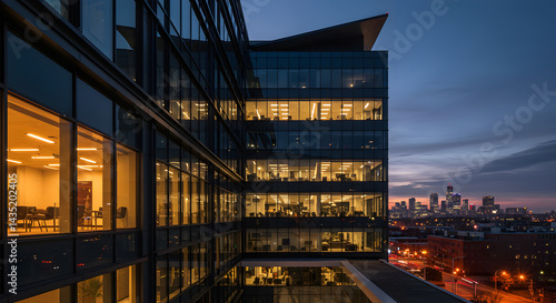 Modern glass office building at twilight, illuminated interior visible through large windows, city skyline in background. Warm interior lighting contrasts with cool dusk sky.