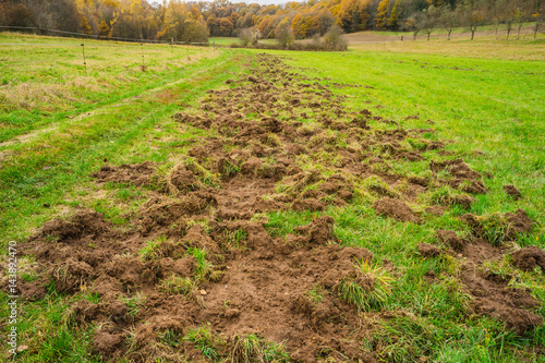 Flurschaden durch Wildschweine auf einer Kuhweide – Field damage caused by wild boars on a cow pasture