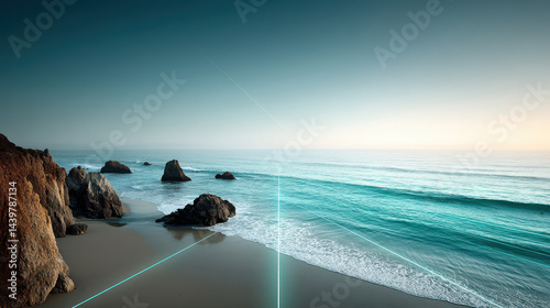 Serene ocean waves disrupted by angular holographic projections and digital grids at sunset