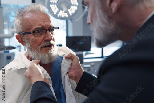 Aggressive man have conflict with doctor, holding him by coat.