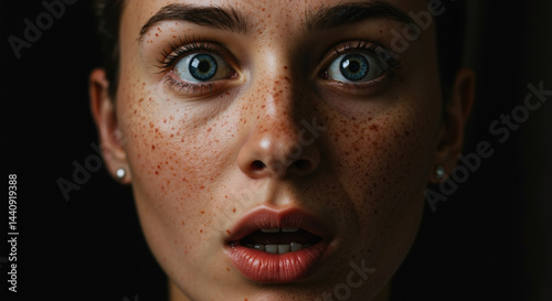 Shocked woman with blue eyes and freckles looking directly at camera against dark background. Dramatic emotion with parted lips. Surprise reaction. Thriller, psychological studies, emotional wellness.