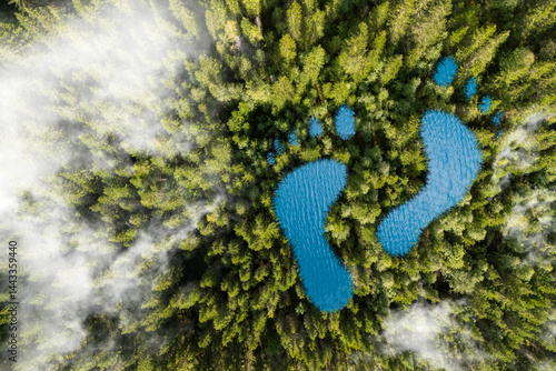A lake in the shape of human footprints in the middle of a lush forest as a metaphor for the impact of human activity on the landscape and nature in general. 3d rendering.