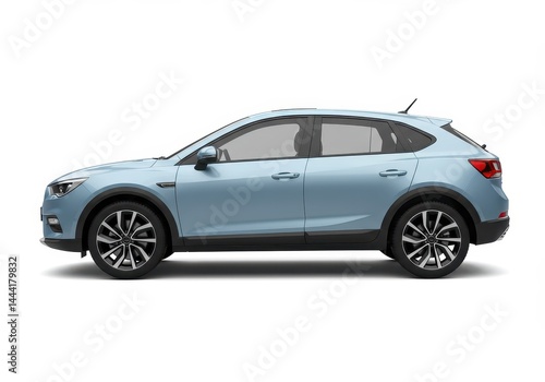 Side view of a light blue crossover car with black wheels on a white background in studio shot