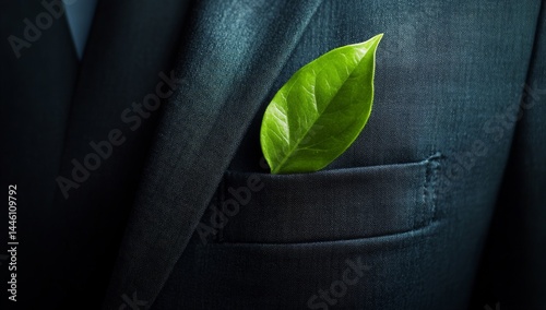 Sustainable business concept. A vibrant green leaf nestled in a suit pocket