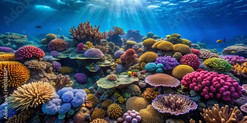 Vibrant Underwater Scene Showcasing a Diverse Array of Coral Reef Life Forms Illuminated by Sunbeams