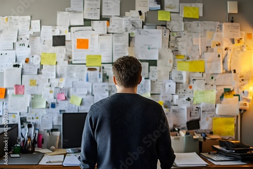 startup owner working on branding strategy, desk filled with documents, stock photo style, realistic,