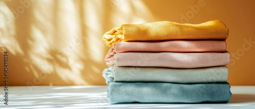 Stack of folded linens presents calming visual through pastel shades, gentle light, organized composition.