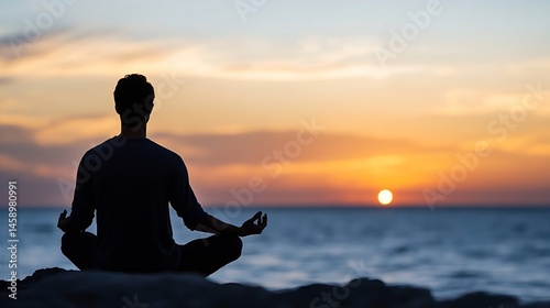 Silhouette of a man meditating in lotus position on a rocky shore, facing a vibrant sunset over the ocean. Peaceful, serene scene. : Generative AI