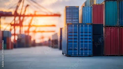A single blue shipping container stands prominently in the foreground, with a blurred background of numerous other containers and large industrial cranes at sunset, suggesting a busy p : Generative AI