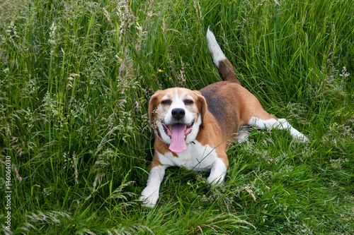 Ziejący zmęczony pies rasy beagle leżący w trawie.