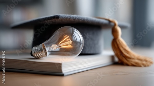 A graduation cap sits on top of a book, accompanied by a glowing light bulb. This arrangement represents the fusion of knowledge and creativity in the educational journey