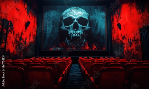 Haunting cinema interior featuring ominous skull projection and red lighting