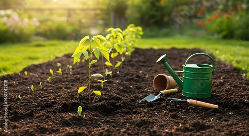 Newly planted tree seedlings in fertile soil, with gardening tools nearby
