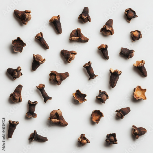 Collection of dried cloves scattered on a clean white background, highlighting aromatic spice details.
