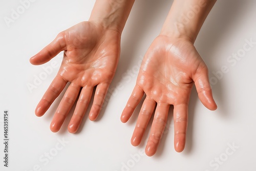 Hands showing signs of excessive sweating, with moist and shiny skin, potentially indicating hyperhidrosis, on a white background