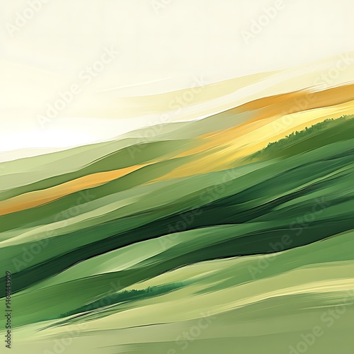 Serene landscape painting; flowing green and gold hills under a soft sky