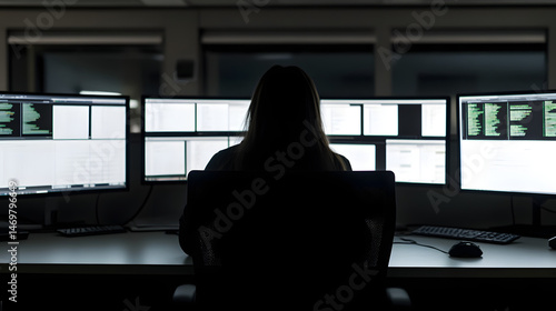 Digital Vigilance: A silhouette of a person, immersed in a realm of data. The glow of multiple monitors illuminates their focused gaze, creating an atmosphere of concentrated work and technical skill.