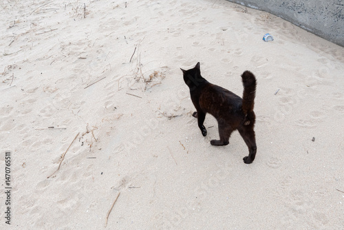 砂浜を歩いている黒猫