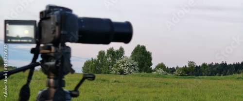 beautiful sunset with a field of grass and a small camera