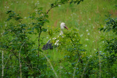 Bocian widoczny w tle spaceruje po łące. Na pierwszym planie gęste zarośla.