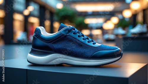 Navy Blue Men's Sports Shoes with Clean White Accents in Luxury Store