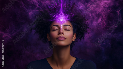 spiritual woman with purple lotus flower on her forehead. transcendence and connection to the universe with purple stream of consciousness. seventh chakra crown chakra activation. purple background