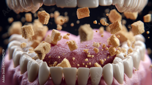 Organs and Function Concept ,Teeth breaking down food with sugar cubes in mouth, showcasing chewing process