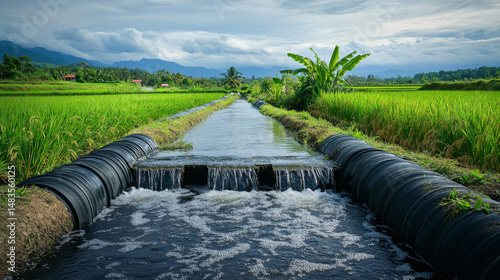 Water from underground is pumped via pipes to irrigate surrounding rice paddies