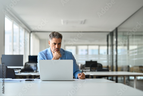 Busy professional executive manager looking at computer in office writing notes, serious old middle aged business man wearing suit working on laptop analyzing financial market, candid photo.