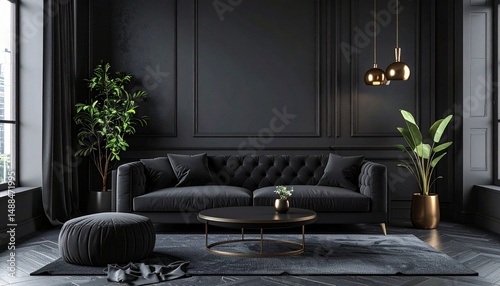 Dark charcoal surface with structured architectural decor and soft cloth accents for a refined, moody setup