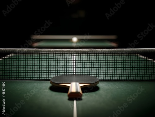 Table tennis net taut and paddle with spin-enhancing rubber poised for competitive fast-paced match intensity