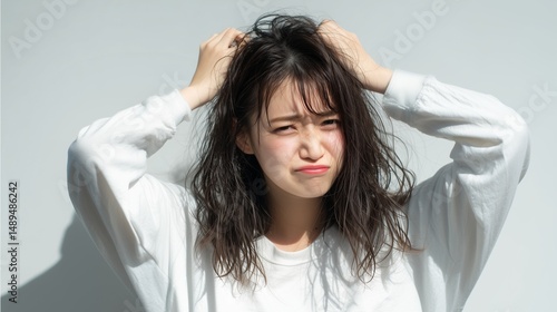 髪型が決まらずにイライラする女性
