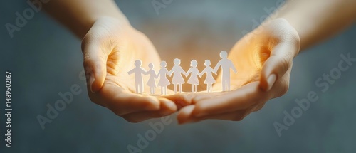 Pair of hands gently holding a glowing paper cutout of a family with adults and children symbolizing care and protection