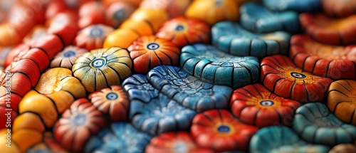 Colorful textured seed-like objects in vibrant reds, yellows and blues, densely packed