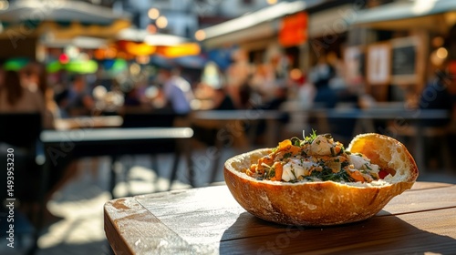 Seafood bread bowl delight: traditional Portuguese "a orda de marisco" with shrimp and mussels on rustic table