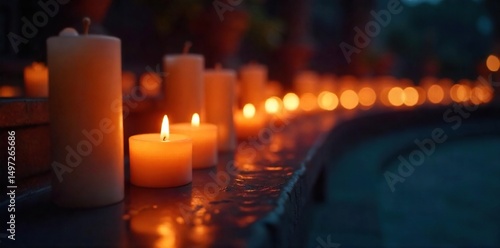 Rows of flickering vigil candlelight illuminate a darkened space, creating a serene and somber atmosphere Perfect for remembrance, reflection, or spiritual themes , mourning, candles, flame