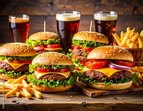 Rożne rodzaje fast food- burgery, cheeseburgery, frytki, napoje gazowane. Niezdrowe, śmieciowe jedzenie